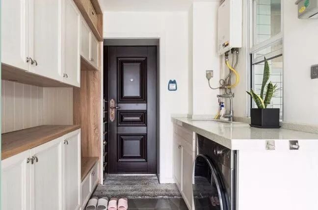 入戶的玄關(guān)走廊被充分利用起來(lái)做了收納,到頂?shù)男裰虚g留出換鞋凳和擺放雜物的區(qū)域,另一側(cè)也做了洗手臺(tái)和洗衣機(jī),還開了個(gè)室內(nèi)窗到廚房。