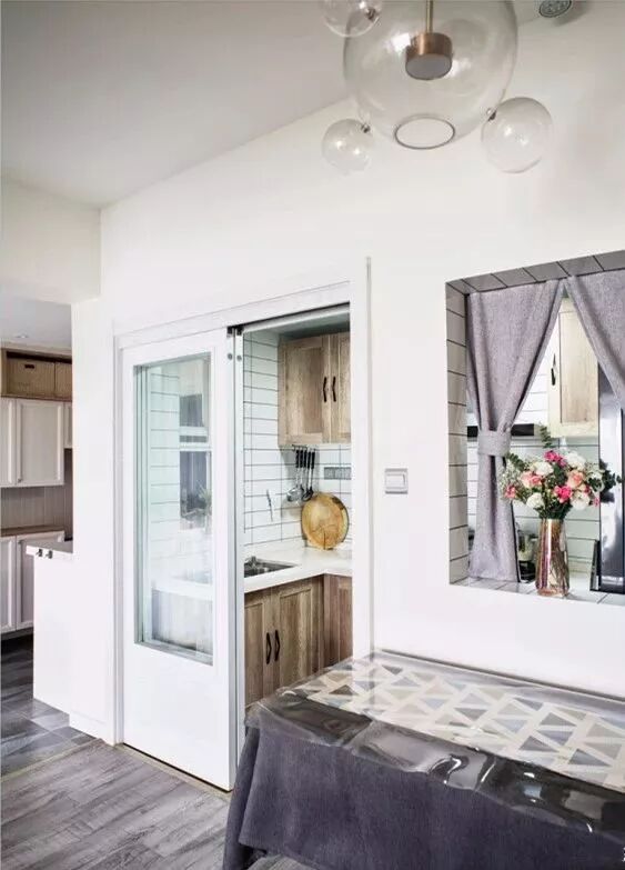 整個(gè)廚房的空間比較小,而且光線也不好,所以設(shè)計(jì)師做了多個(gè)室內(nèi)窗來(lái)引流光線,門也是選擇了白框的玻璃推拉門,看起來(lái)寬敞了許多。