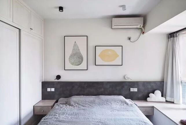 主臥室內(nèi)部空間不大,把一側(cè)的床頭柜連著飄窗一起設(shè)計(jì),擴(kuò)展一些擺放零碎小物的空間,床頭背景墻上做了黑色的護(hù)墻板,和白色墻面、灰色軟裝結(jié)合,簡(jiǎn)約而又時(shí)尚。