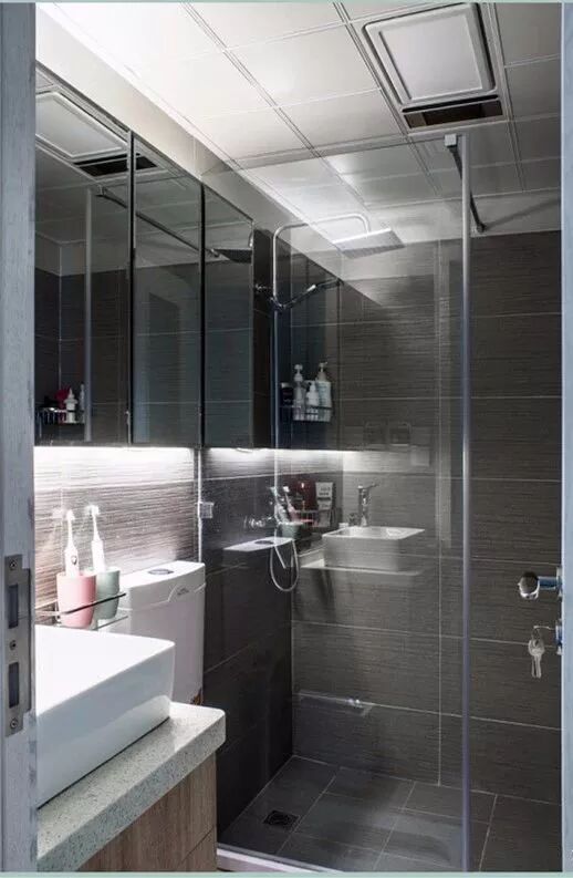 深灰色調(diào)的衛(wèi)生間,在洗手臺(tái)上方的墻面裝了不銹鋼擱架來(lái)增強(qiáng)收納能力,搭配鏡柜和藏光,這個(gè)衛(wèi)生間簡(jiǎn)潔大方又實(shí)用。
