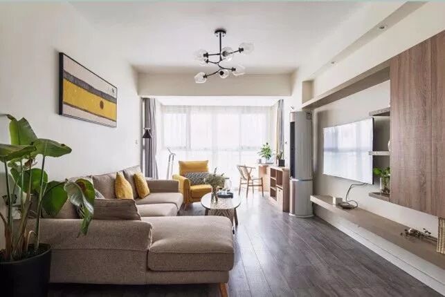 沙發(fā)背景墻是大白墻加上掛畫的設(shè)計(jì),顯得更為簡(jiǎn)潔,棕色的布藝沙發(fā)和黃色的單椅在綠植的點(diǎn)綴下,顯得活力而又自然。