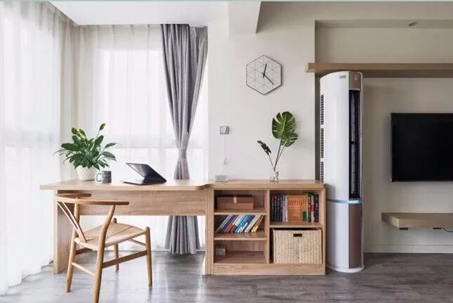 位于客廳和陽(yáng)臺(tái)之間的書房,書桌加上矮柜的設(shè)計(jì),書柜上方擺放了綠植和掛鐘,灰色的窗簾和白色紗簾組合,非常好看。