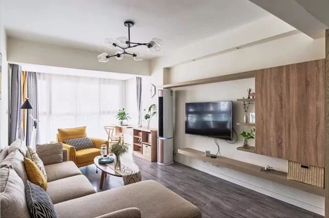 走過(guò)玄關(guān)就到了客廳空間,客廳和陽(yáng)臺(tái)打通,所以看起來(lái)非常寬敞,木質(zhì)柜子和隔板組成了電視背景墻,滿足收納的需求。