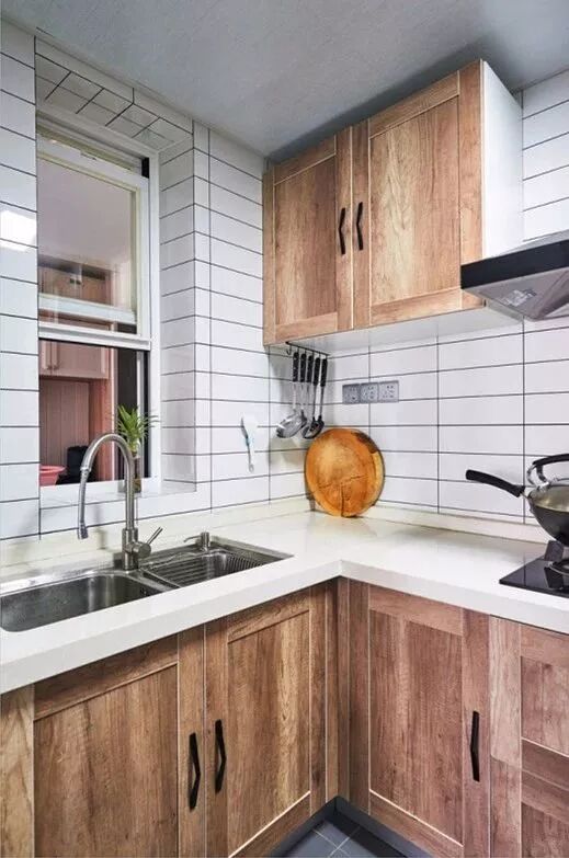 廚房?jī)?nèi)部就是L型的櫥柜布局,灰色的地面和木質(zhì)柜體、白色臺(tái)面和墻面結(jié)合,是比較常見的北歐風(fēng)廚房搭配方案,簡(jiǎn)潔而又舒適。